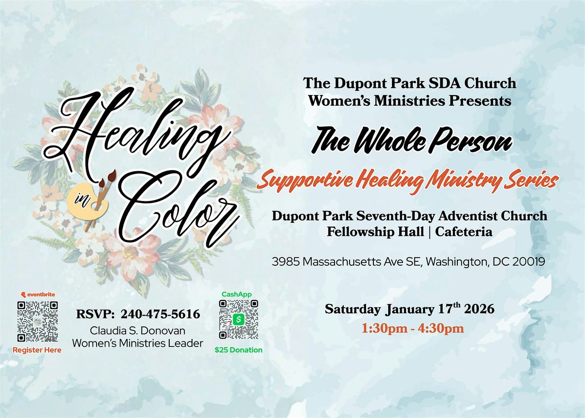 Healing in Color is the perfect in-person event to let your creativity flow and your mind relax in a calm, supportive environment. This will be the beginning of a continued series of healing experiences sponsored by the Women's Ministries of Dupont Park SDA Church. All are welcome. No experience needed.