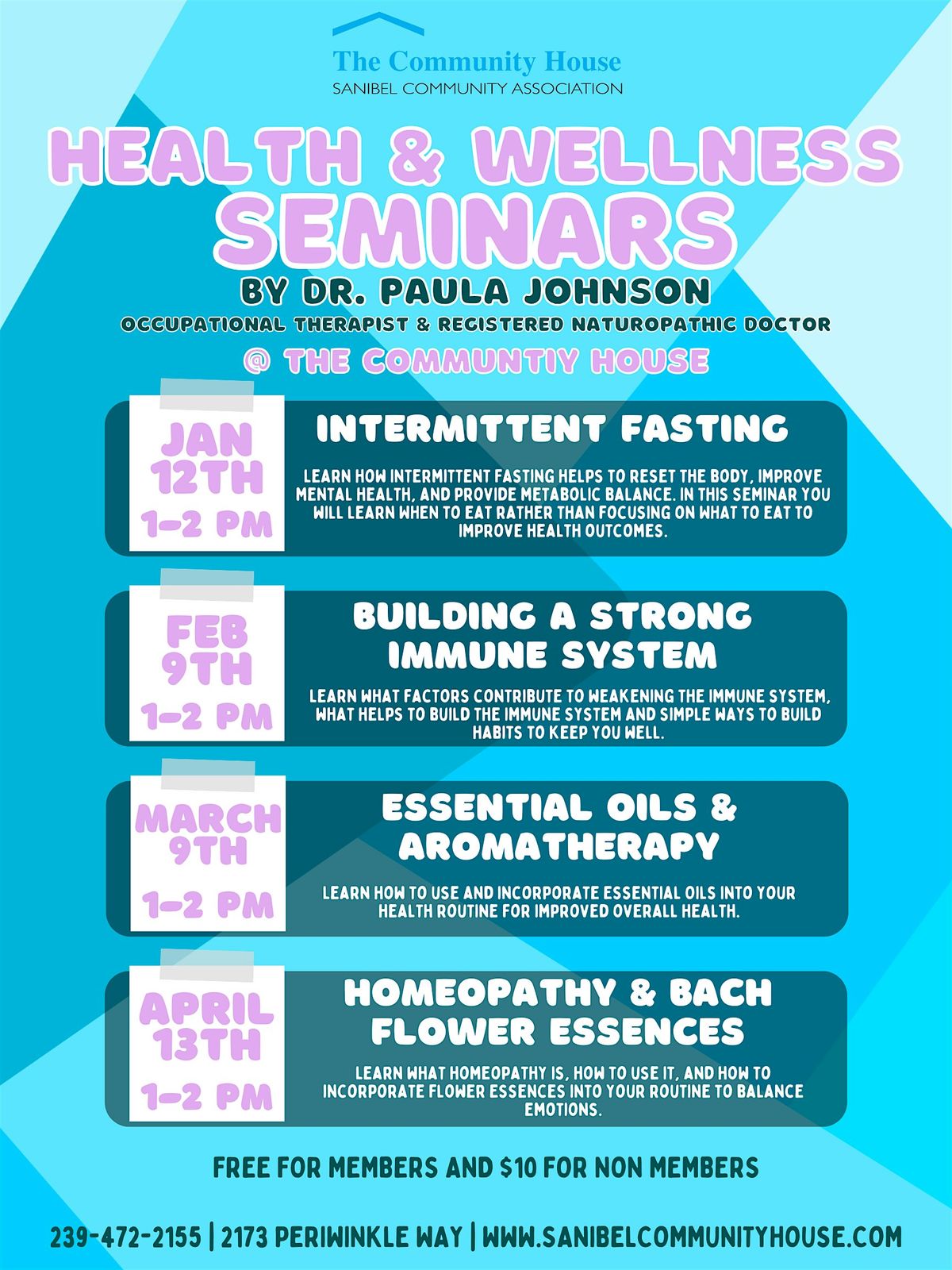 Join us for some amazing in-person sessions with Paula Johnson! Free for members and $10 for non members. These seminars are perfect if you want to dive into all things health and wellness. Paula will share practical tips, answer your questions, and help you feel great inside and out. Each seminar will cover a different topic.