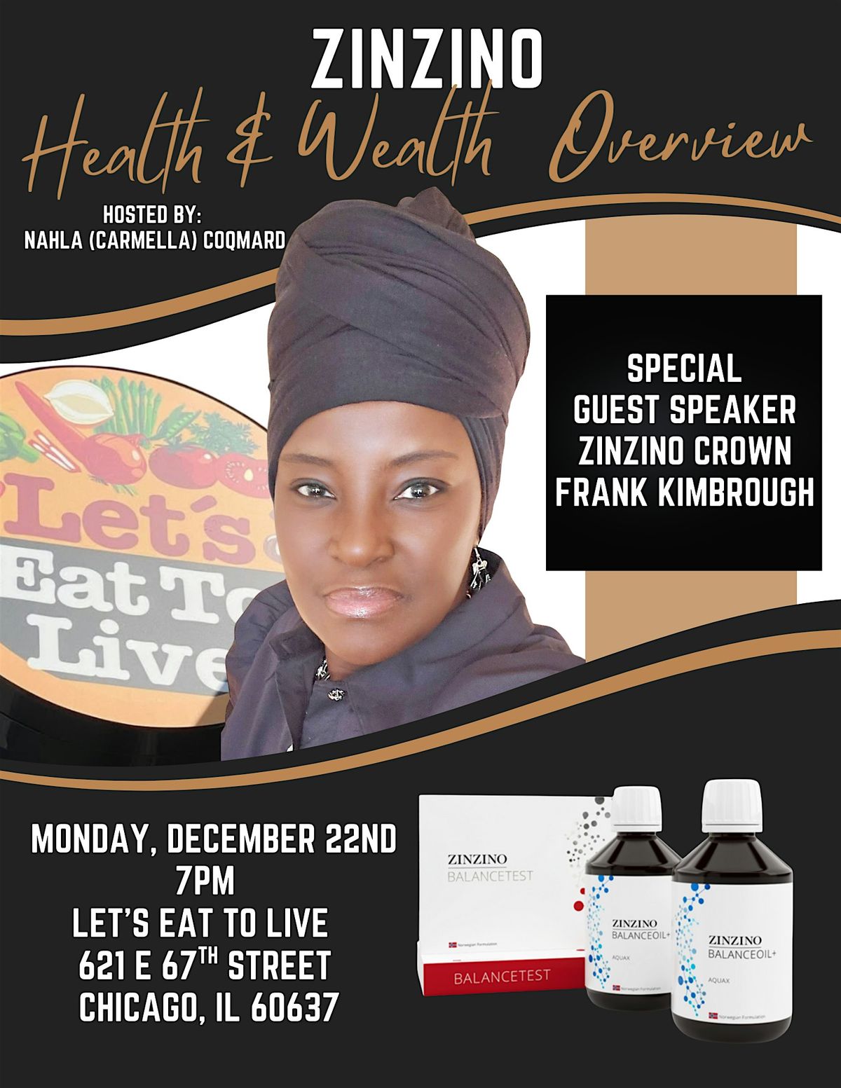 Join us for an inspiring night hosted by Nahla (Carmella) Coqmand with a special guest speaker, Zinzino Crown Frank Kimbrough. Learn practical tips on health, wealth, and balance—and how to elevate your life with Zinzino’s Balance products.