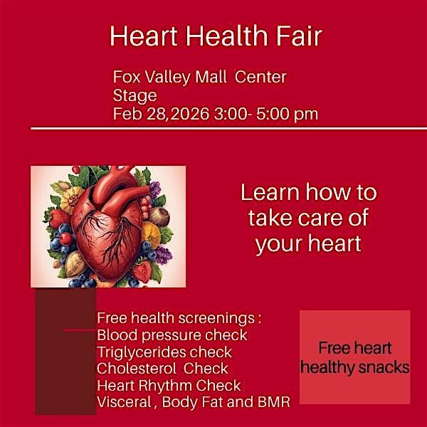 Take a step toward a healthier heart at our Heart Healthy Fair on February 28 from 3–5 PM at Fox Valley Mall – Center Stage. (195 Fox Valley Center Dr, Aurora, IL 60504) Join us for a special presentation on how to take care of your heart, along with free health screenings, including blood pressure, triglycerides, cholesterol, heart rhythm, visceral fat, body fat, and BMR.