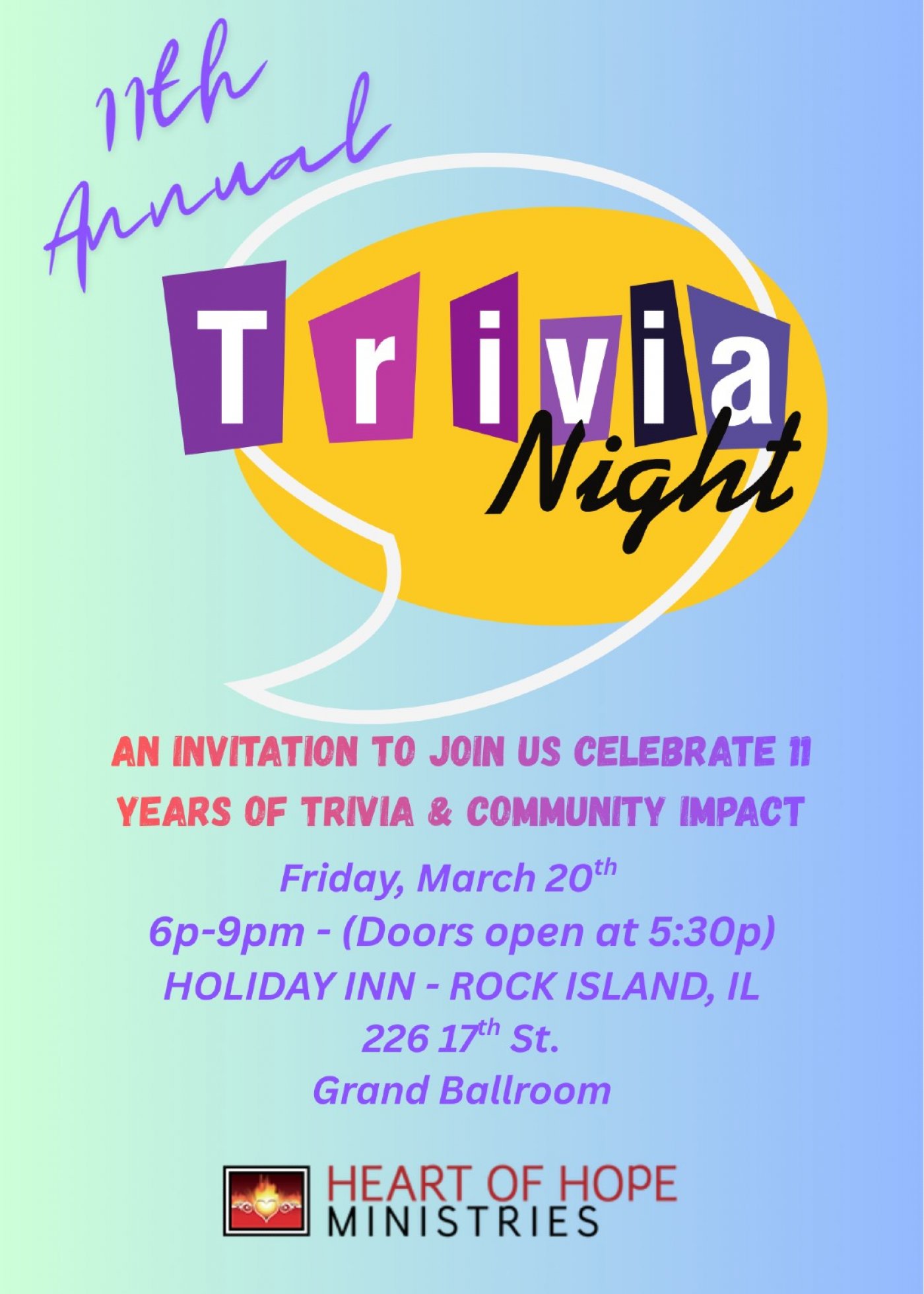 Get ready for a night of laughs, teamwork, and brain-teasing fun at Heart of Hope’s 11th Annual Trivia Night! Join us on Friday, March 20th, from 6:00–9:00 PM at the Holiday Inn Rock Island – Grand Ballroom for an exciting evening supporting a powerful cause.