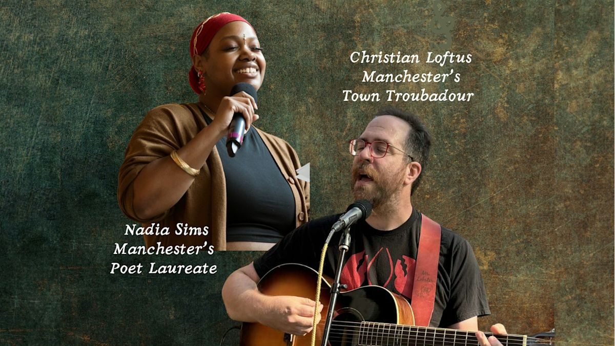 UUSE will host an unforgettable evening of music and poetry featuring Christian Loftus, Manchester's own troubadour, and Nadia Sims, the town's celebrated Poet Laureate. This unique collaboration brings together two of Manchester's most gifted artists for a night of soul-stirring songs and evocative spoken word. Loftus's heartfelt melodies and rich storytelling will intertwine with Sims's powerful poetry, offering a performance that is both moving and inspiring. The event is open to the public and all are welcome to attend. Admission is free but donations to UUSE are welcome.