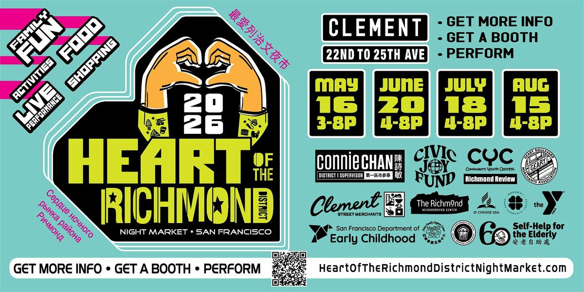 Thank you to Agape Community Center, Asian Family Support Center, Civic Joy Fund, Community Youth Center of San Francisco (CYC), Clement Street Merchants Association, Geary Merchant Association, Gum Moon, Office of Supervisor Connie Chan, Richmond District YMCA, Richmond Neighborhood Center, Richmond Review, San Francisco Department of Early Child Development, Self Help for the Elderly, and SF SDA Chinese Church for making these events possible.