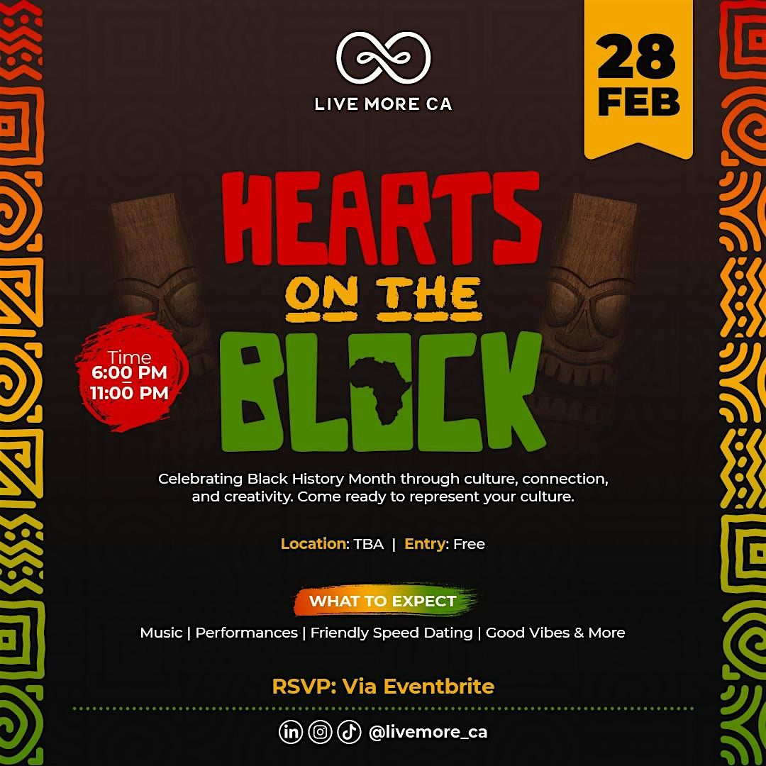Hearts on the Block is Live More Canada’s Black History Month celebration a night designed for culture, connection, and community. On February 28th, we’re bringing people together for an unforgettable experience filled with music, performances, friendly speed dating, and nonstop good vibes. This is more than just an event it’s a space to represent where you come from, meet new faces, and celebrate Black joy through creativity and togetherness. Whether you’re coming with friends or arriving solo, you’ll be welcomed into an atmosphere built on energy, culture, and shared stories. Entry is free, doors open at 6:00 PM, and the night runs until 11:00 PM. Location details will be announced soon. RSVP through Eventbrite and be part of a night that honors Black History Month in a way that feels alive, vibrant, and real. Spots are limited.