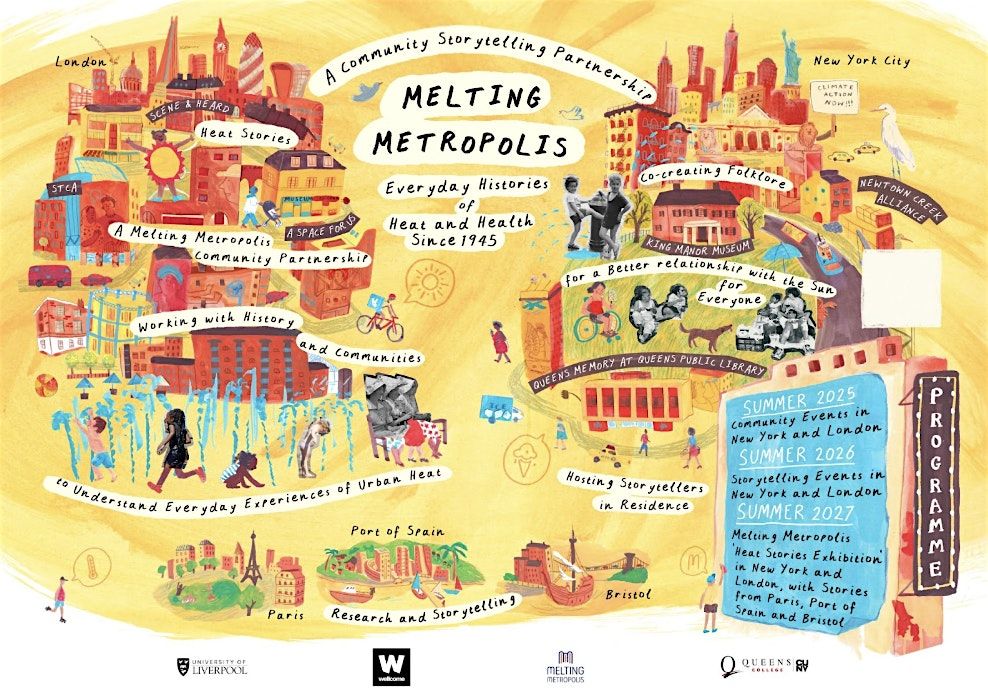 Join Queens Memory and community partners from the Melting Meltropolis project to learn more about how communities are documenting local climate impacts related to urban heat. Listen to stories from across the boroughs about how our neighborhoods are changing and adapting to longer and hotter summers, share your own experiences, and reflect on how these everyday stories enter our collective memory.