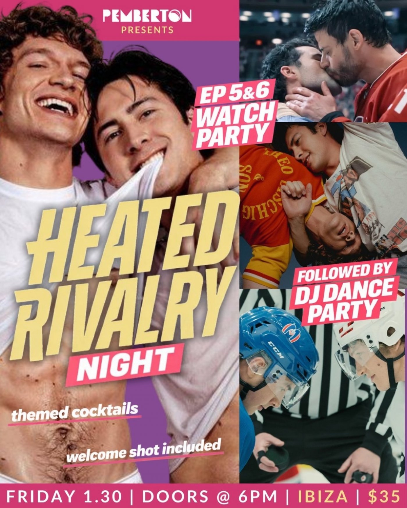 Doors open at 6:00 PM to enjoy Heated Rivalry themed cocktails, fun photo opps, and group shots off a hockey stick! At 6:30 PM, watch a screening of Episodes 5 & 6 together with laughter, tears, and take in all that is stars Connor Storrie and Hudson Williams. Once the episodes end, the night turns into a dance party! A DJ will take over with the best girls, gays & they’s anthems, while the tv screen will display iconic moments from the show and cast. Tickets are $35 and include a welcome shot. Tickets go on sale at thepemberton.com at noon on January 16.