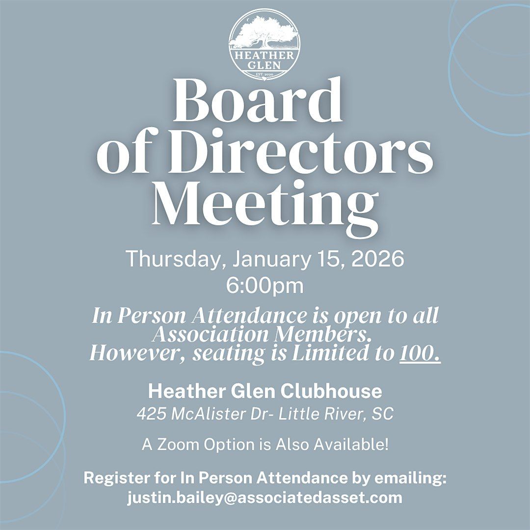 Welcome to the Heather Glen Board of Directors Meeting! Join us at 425 McAlister Dr on January 15, 2026 at 6:00 PM (Eastern Time) for an evening of important discussions and decisions. Your presence and input are valuable to us. Let's work together to make our community even better. See you there!