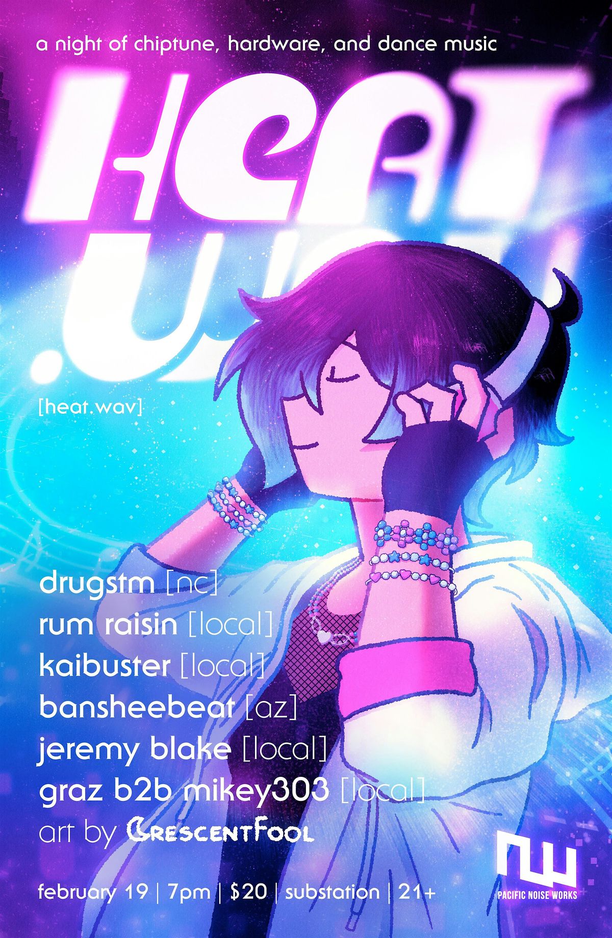 Pacific Noise Works celebrates its 9th year of HEAT.WAV events, bringing you radical new sounds on retro hardware and retro sounds on new hardware alike! We welcome 2026 with a killer lineup of chiptune, electronic, and live hardware music that you won't want to miss!