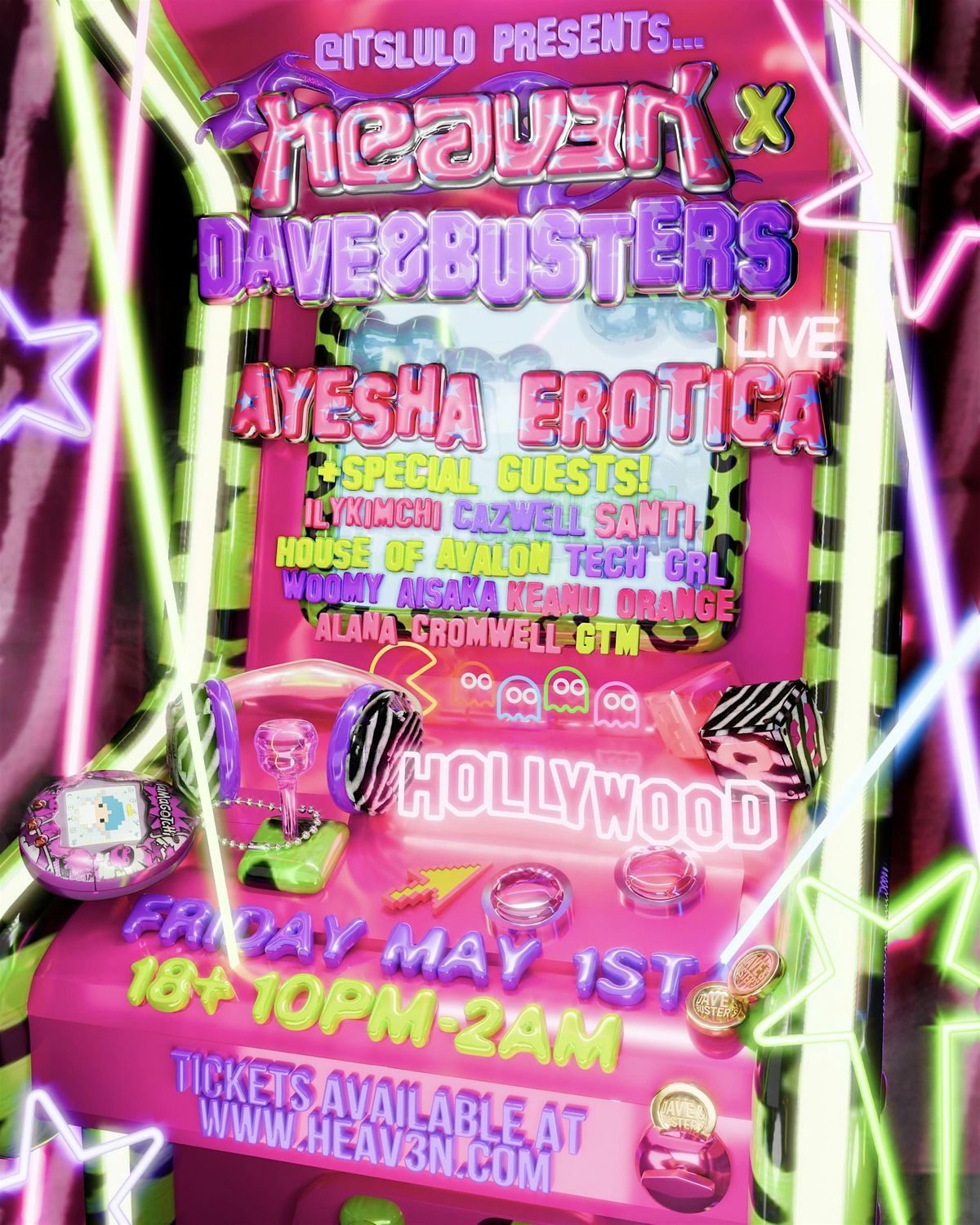 Join us in Hollywood as we takeover Dave & Busters w/ a live performance by the queen Ayesha Erotica + many more!! ๐ This is going to be a fun one 0;-) get ur tix while they last!!! www.heav3n.com ๐18+ // 10-2AM\
