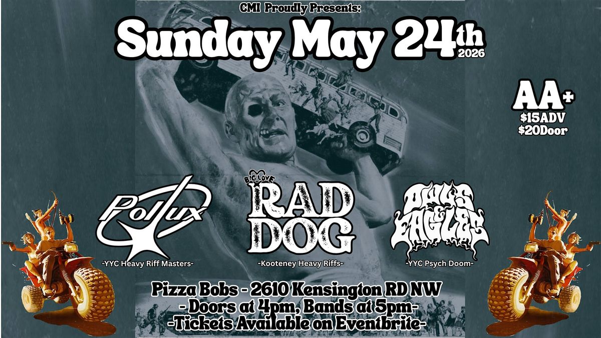 BC's Rad Dog and AB's Owls & Eagles are getting together for a quick run through the prairies. Day 3 is the best day, and wrapping up the best 3 day tour we rip Pizza Bobs for Heavy Riff Sunday #2, And for Calgary we've added local heavyweights Pollux, These rippers are always a great time, so dont sleep on this one folks, its destined to be a great show..PS...The weekend forecast calls for heavy riffs, and good times.