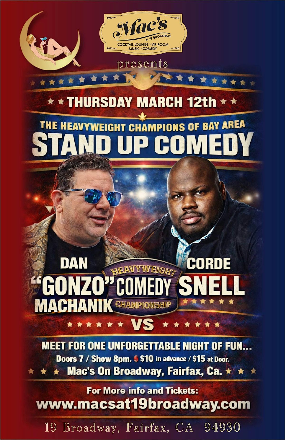 Mac’s at 19 Broadway presents The Heavyweight Champions of Bay Area Stand-Up Comedy — a high-energy comedy showdown featuring two powerful, crowd-tested performers in one room, one night.