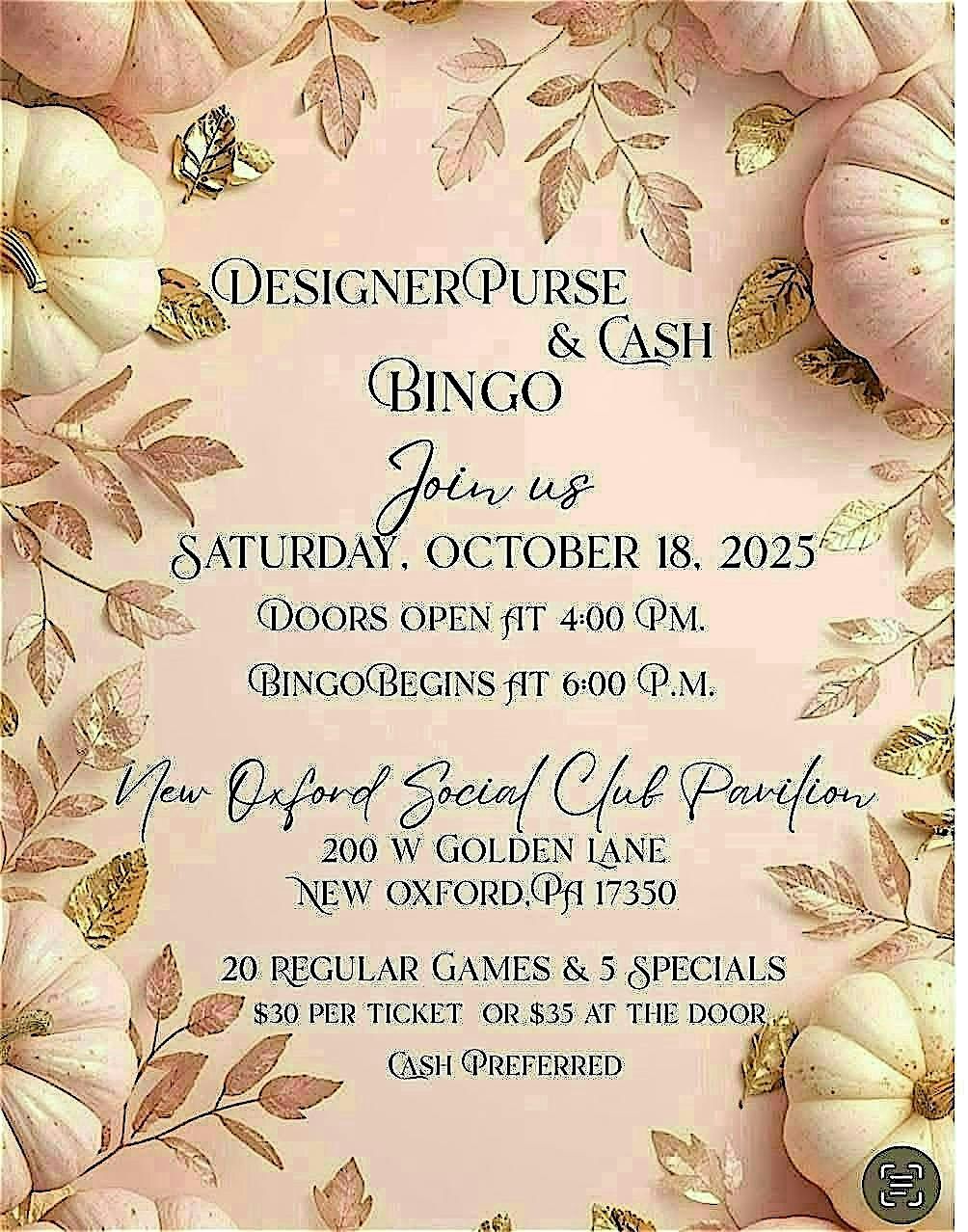 Welcome to the HEC Athlete Fund Designer Purse & Cash Bingo event! Join us at the New Oxford Social & Athletic Club Pavilion for a fun-filled evening of bingo, prizes, and supporting a great cause. Get ready to play bingo and win fabulous designer purses and cash prizes while helping athletes in need. Don't miss out on this exciting event - mark your calendars and spread the word!
