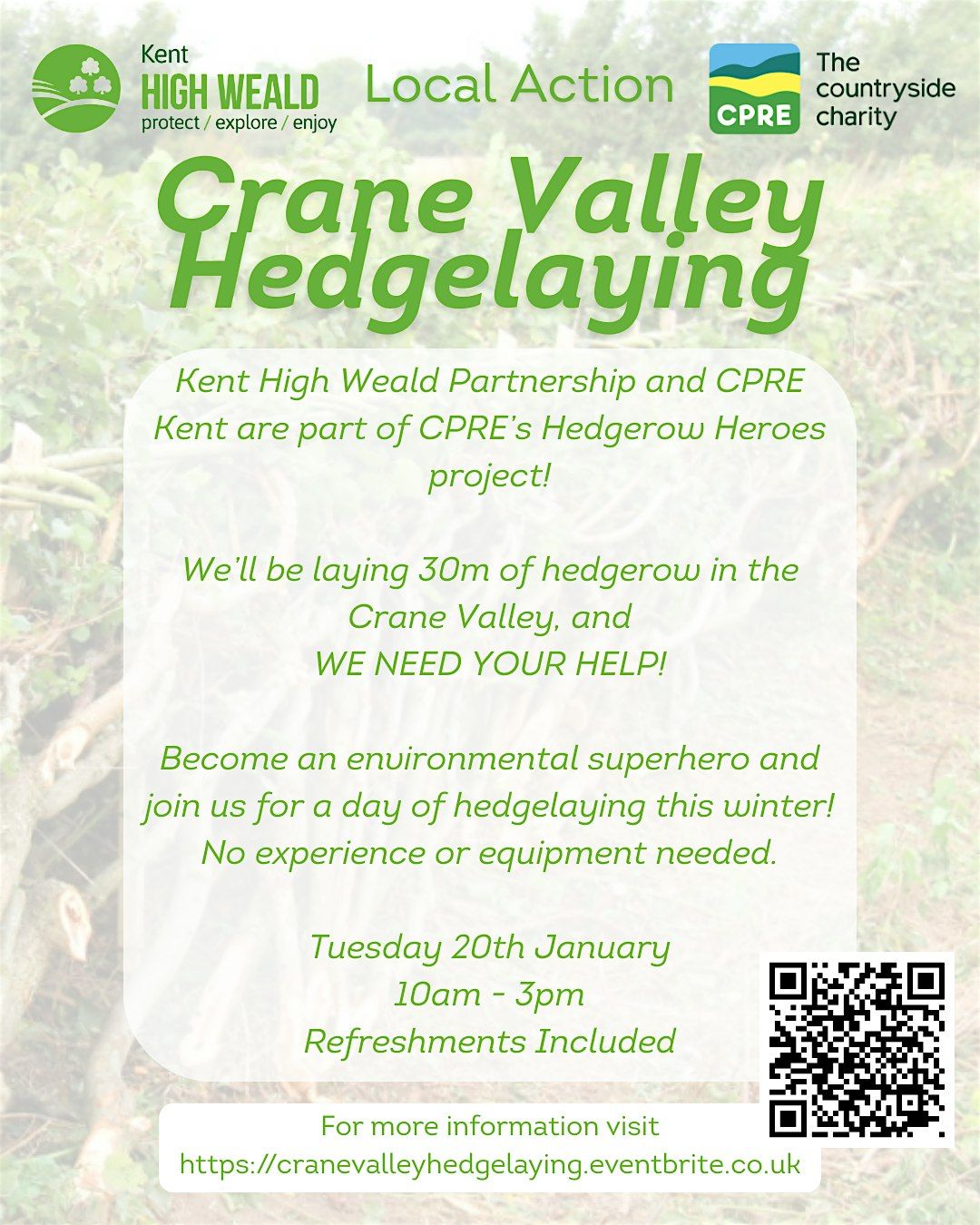 Join us in person for a hands-on day of hedgelaying at beautiful Crane Valley! Whether you're a newbie or a nature lover, come help us transform the hedgerows and become a true Hedgerow Hero. It's a fun way to get outside, learn a cool traditional skill, and give back to the environment. Don't miss out — grab your boots and let's get laying!
