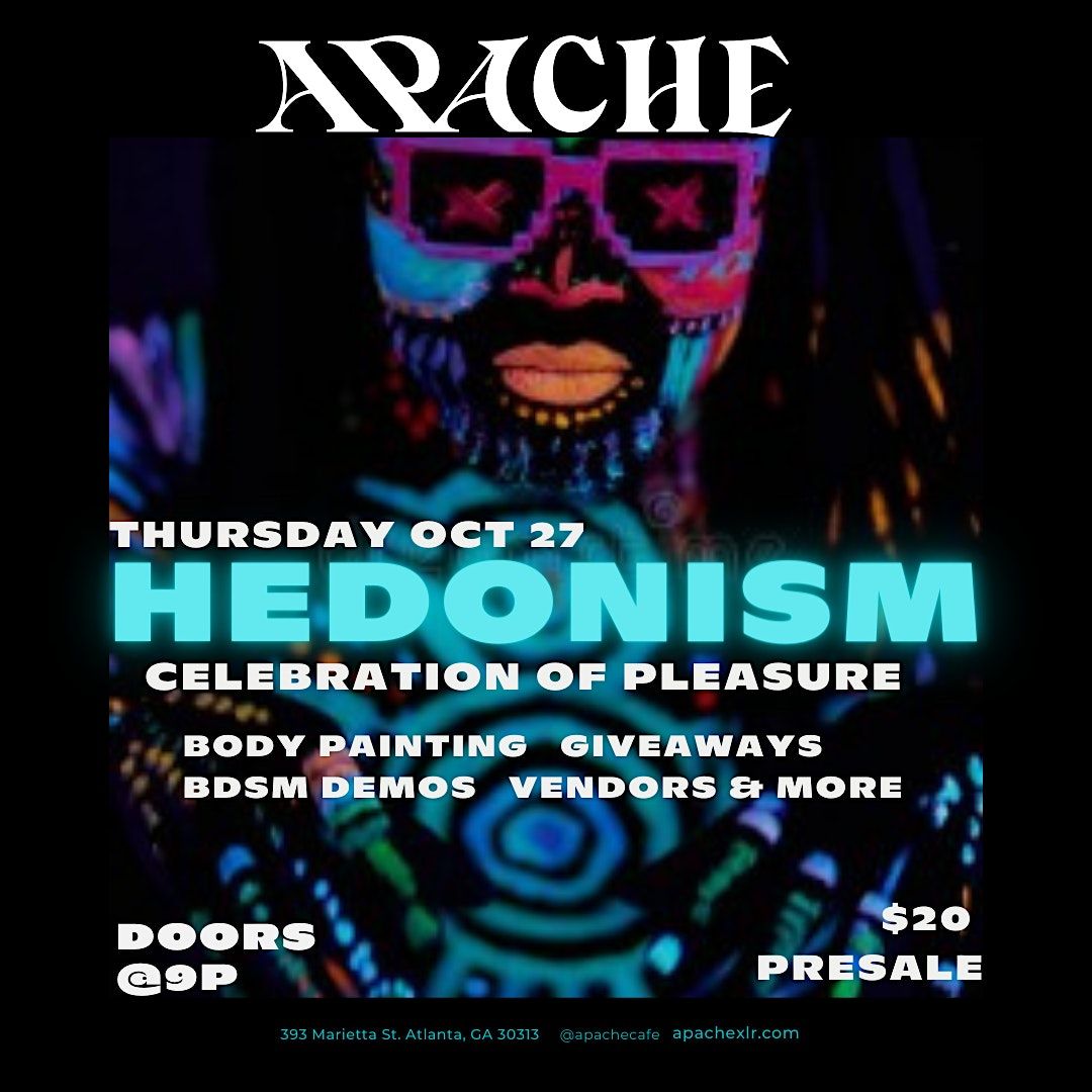 WHAT: Hedonism: A celebration of Pleasure - imagine; Body painters on site helping you express yourself, vendors with sexy goods, art, and services for your pleasure, interactive games and kinky demos with your host Divine Rae, and dancing to your Reggae/Reggaeton, Afro-beats, and trap favorites! We're bringing carnival vibes to ATL!