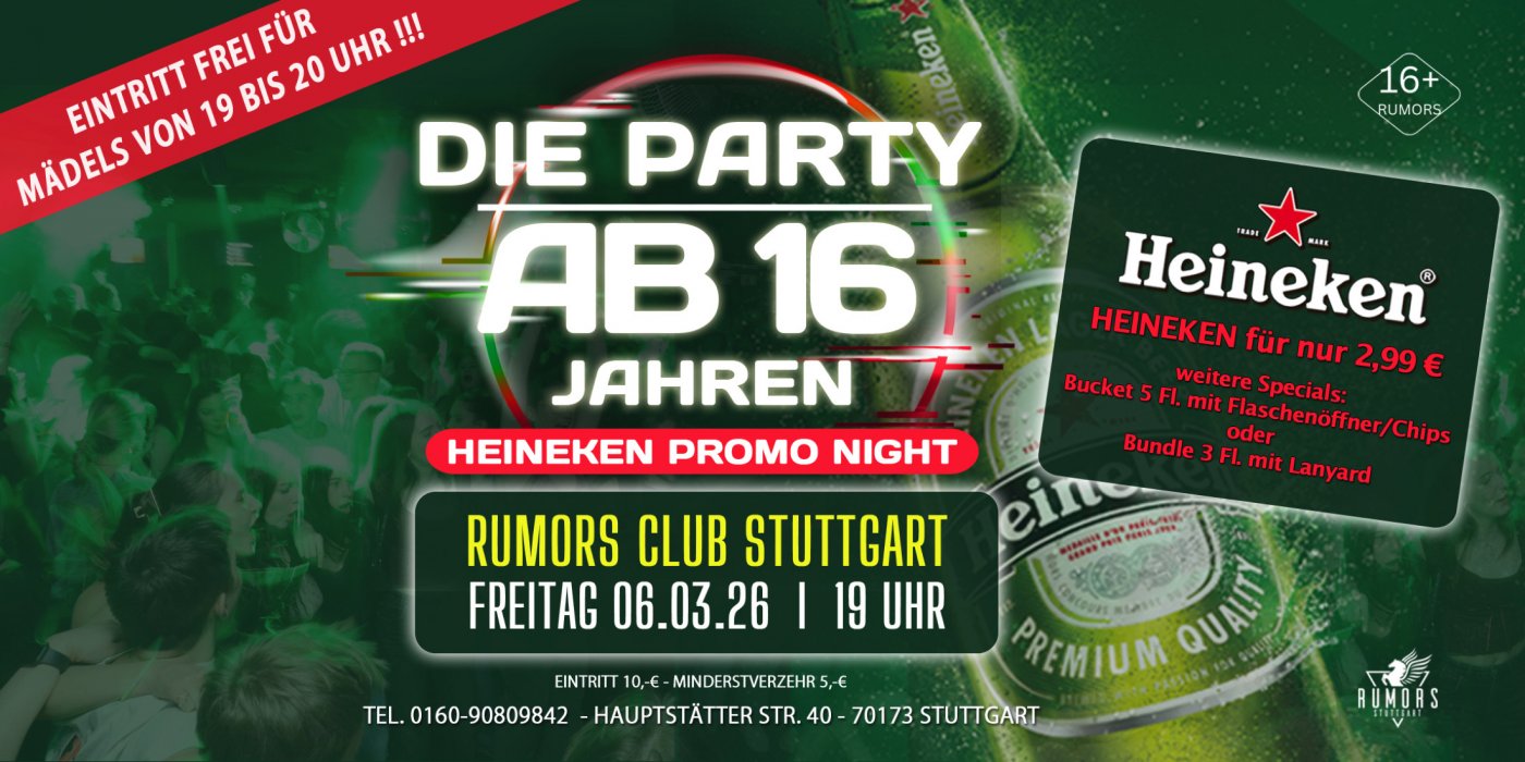 ☝️ Einmal im Jahr findet unsere Heineken Promo-Night statt und am Freitag, den 06.03.2026 ist es endlich wieder soweit – exklusive von WTTW@RUMORS – der angesagtesten Party in Stuttgart ab 16!