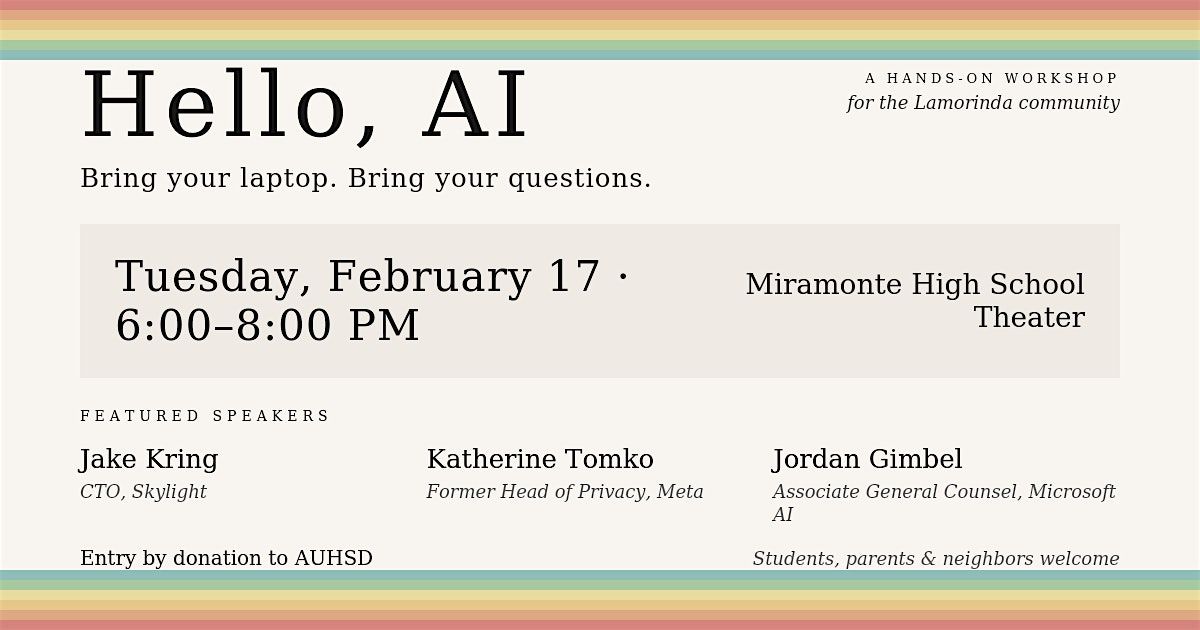 Join us for a free, hands-on workshop designed for students, parents, and anyone in the Lamorinda community who wants to understand AI — not just the hype, but the practical reality.