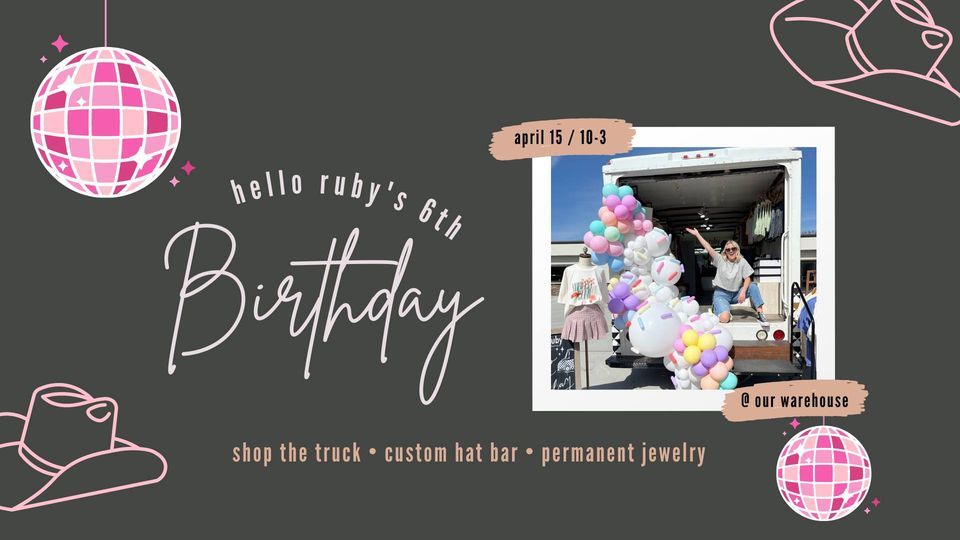 join hello ruby as we celebrate 6 years of business because of you! we thank you! we'll be opening the fashion truck and our warehouse for a day full of activities including shopping our brand with a sneak peek of our summer collection, permanent jewelry and a custom hat bar.