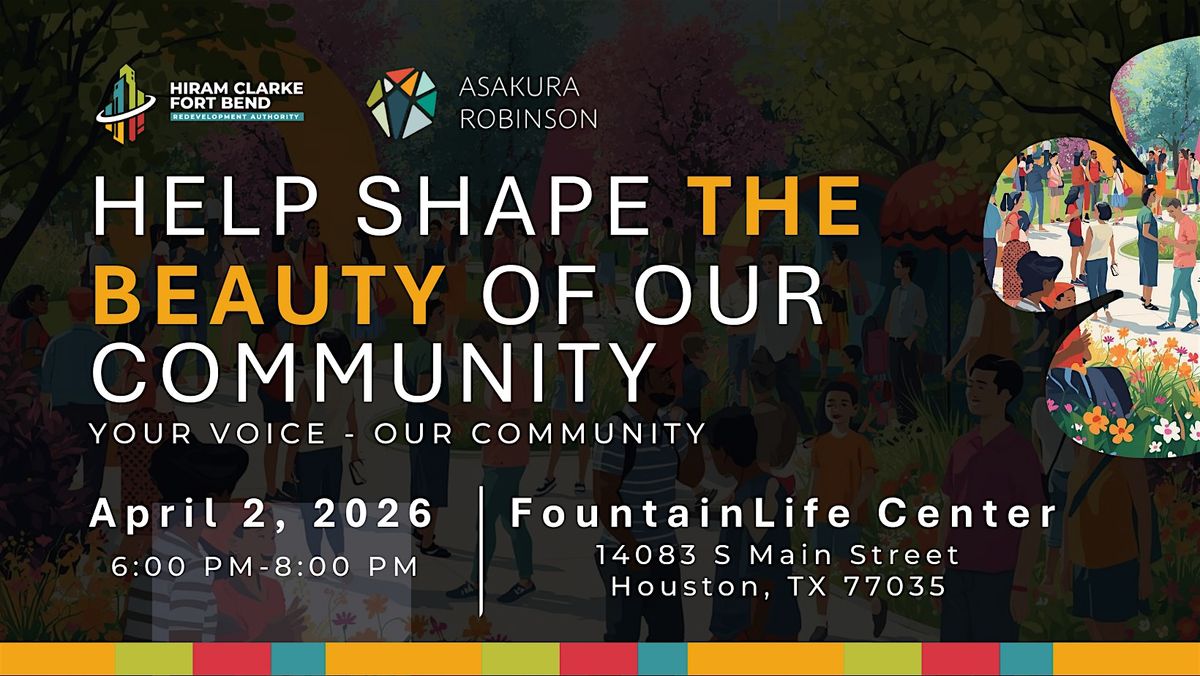 Hey there! Join us in person to have your voice heard and make a real impact. The Hiram Clarke / Fort Bend area is growing, and we want the community to help shape how it looks and feels.