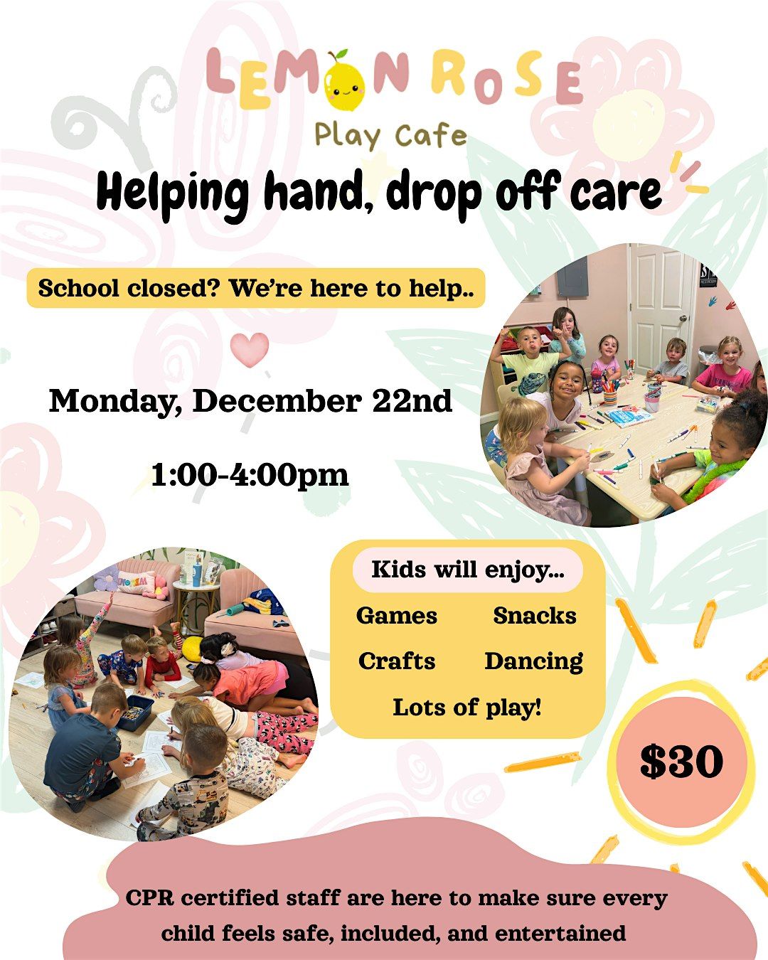 Join us for Helping Hand Drop-Off Care — a safe, engaging, and community-focused option that gives parents peace of mind while kids enjoy a fun-filled afternoon.