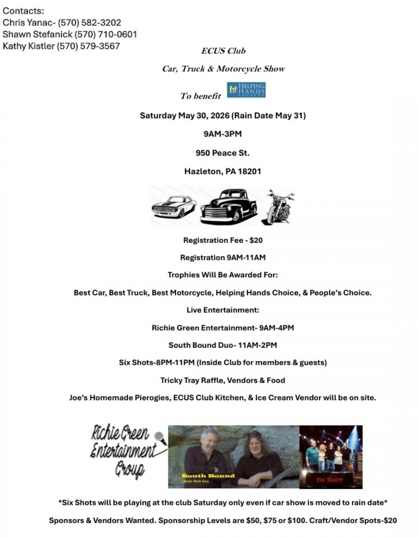 Car, trucks & motorcycles, live entertainment, food, raffle & vendors. May 30, 2026 from 9am-3pm. (Rain date May 31.) Trophies will be awarded for Best car, Best truck, Best motorcycle, Helping Hands choice & people's choice. Registration is $20 per vehicle. Registration will be from 9am-11am. Vendor spots are $20 for a 10x10 space. Event will be held at the ECUS Club at 950 Peace St. Hazleton, PA 18201. All proceeds from the event will be donated to The Helping Hands Society. Entertainment: Richie Green Entertainment, South Bound Duo & Six Shots. If interested in becoming a vendor please contact Chris (570) 582-3202, Shawn (570) 710-0601 or Kathy (570) 579-3567.