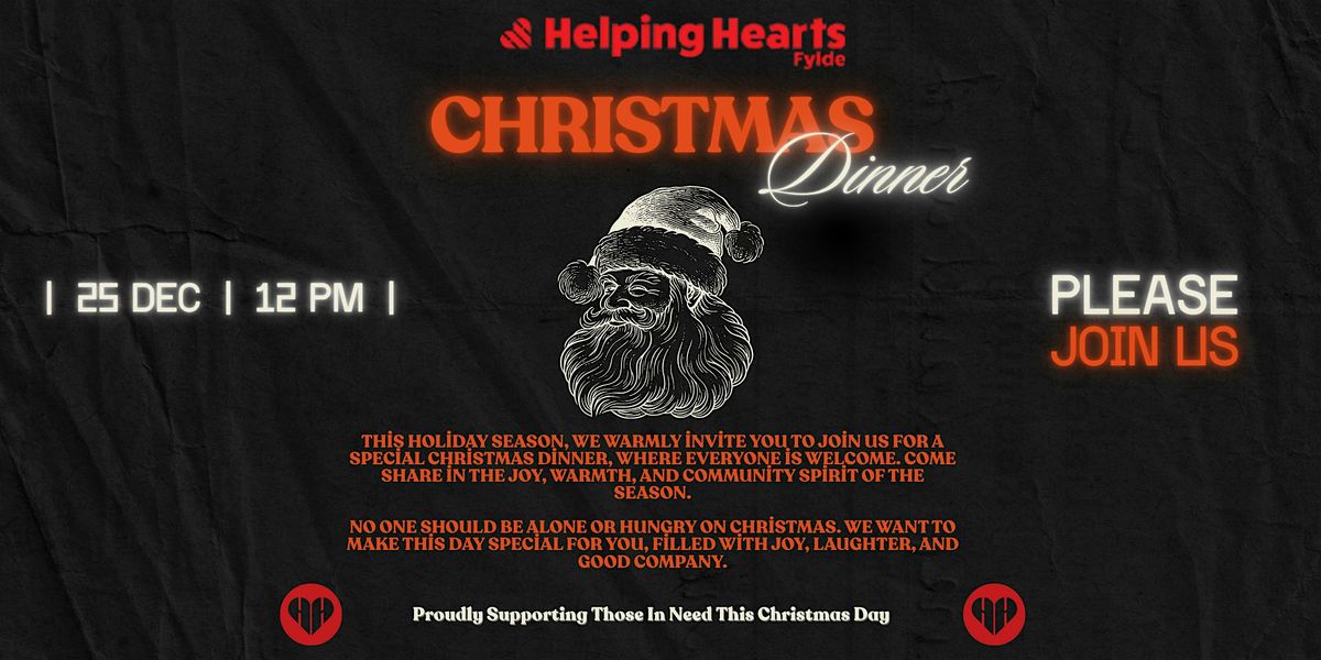 Helping Hearts Fylde warmly invites you to join us for a heartfelt Christmas dinner on December 25th at 12 PM, specifically for those who may be in need.