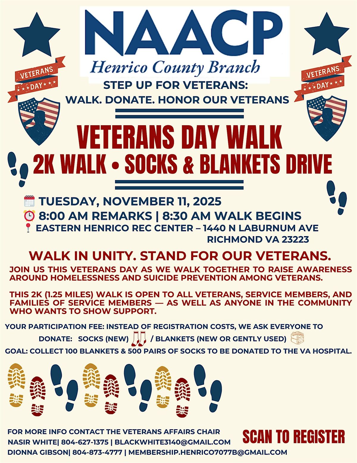 Get ready to walk for a great cause and honor our veterans! This in-person event brings the community together for a fun and meaningful 2K walk and sock and blanket drive. It’s a perfect way to get moving, meet awesome people, and show respect for those who served. Don't miss out on this chance to support the Henrico County NAACP and celebrate our heroes. Come out, bring your friends, some socks and blankets. Let’s make it a day to remember!