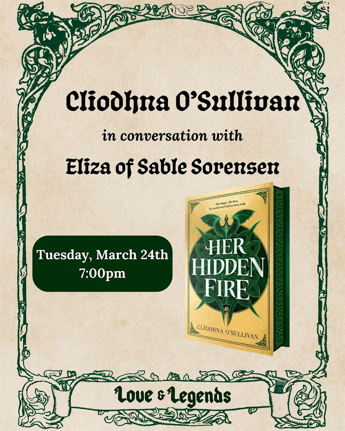 Join us for the release of HER HIDDEN FIRE, a brand new heart-pounding YA romantasy from Cliodhna O'Sullivan, who will be joined in conversation with Eliza of Sable Sorensen. Each ticket includes event access, as well as a signed copy of the book.