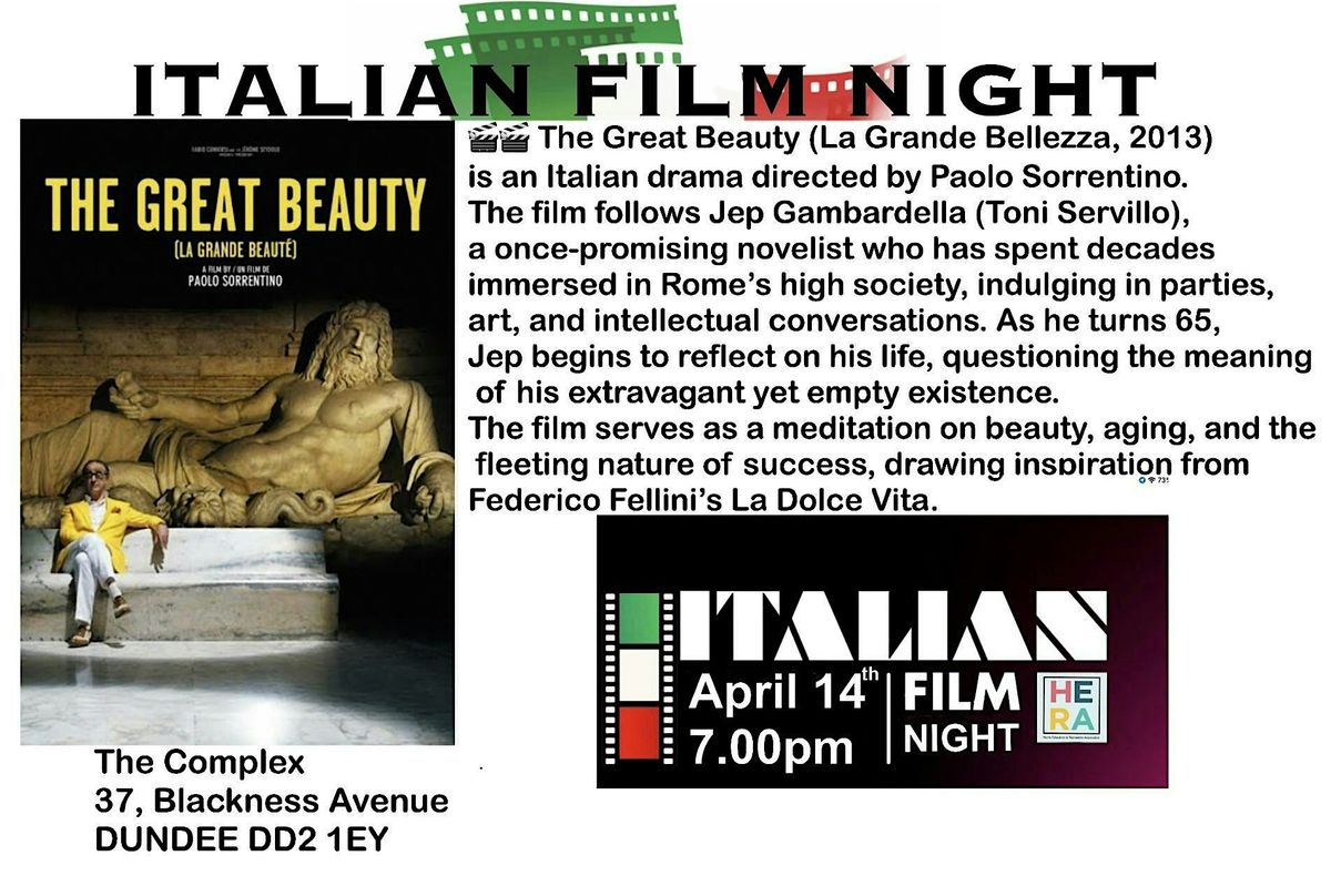 HERA's Italian class is having a free film night, where we will be showing the 2013 Italian film, The Great Beauty.