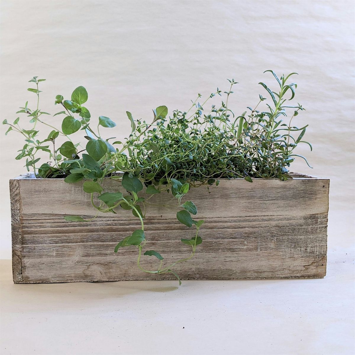 Natural Finish Wood Planter, Soil, Drainage Gravel, Moss, Fresh Herb Plant(s)