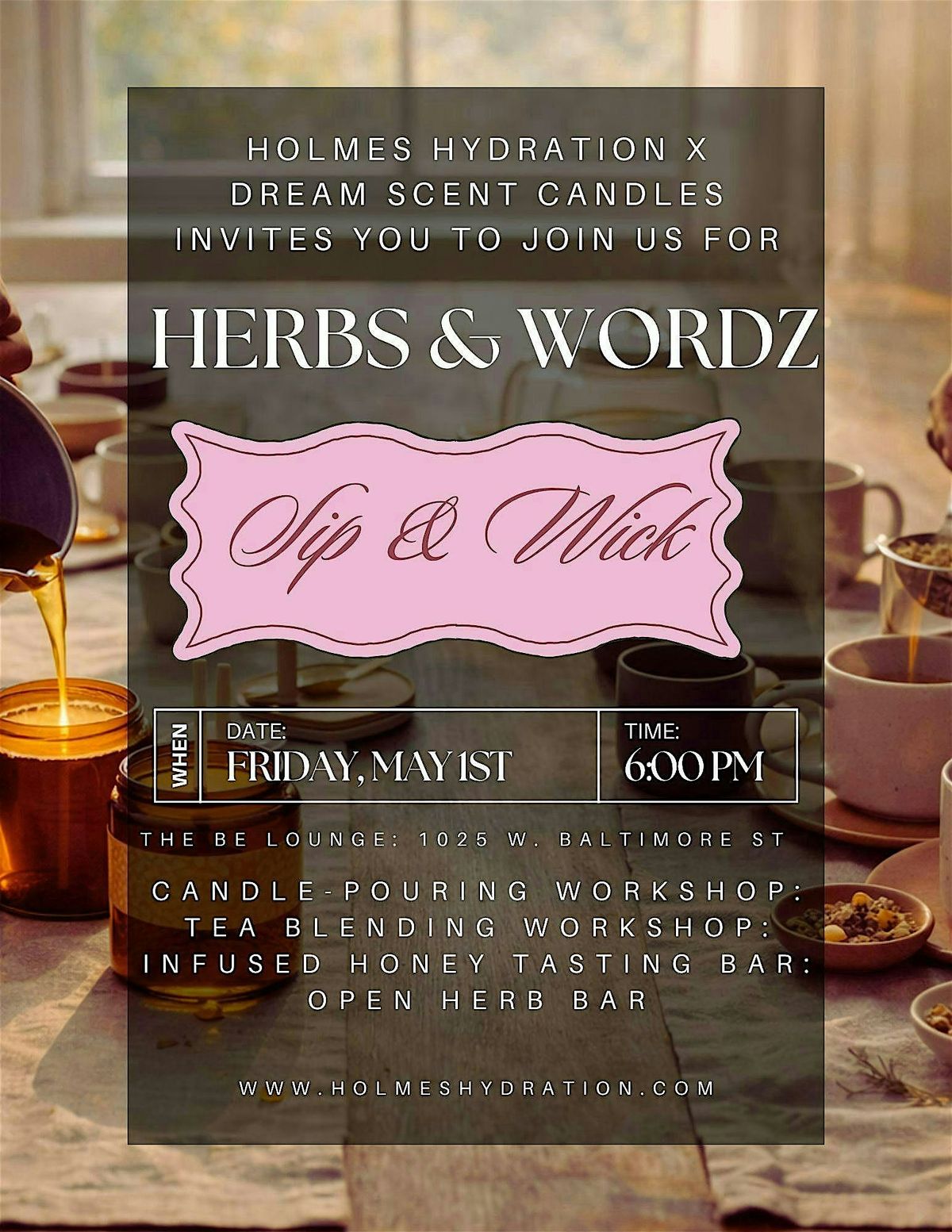 Sip & Wick is a returning chapter of our Herbs & Wordz event series, brought back by demand for another evening of creativity, culture, and connection. Hosted by Holmes Hydration x Dream Scent Candles inside BE Lounge, this experience blends candle making, tea blending, infused honey tasting, and herbal exploration in a gallery filled with Black-owned art.