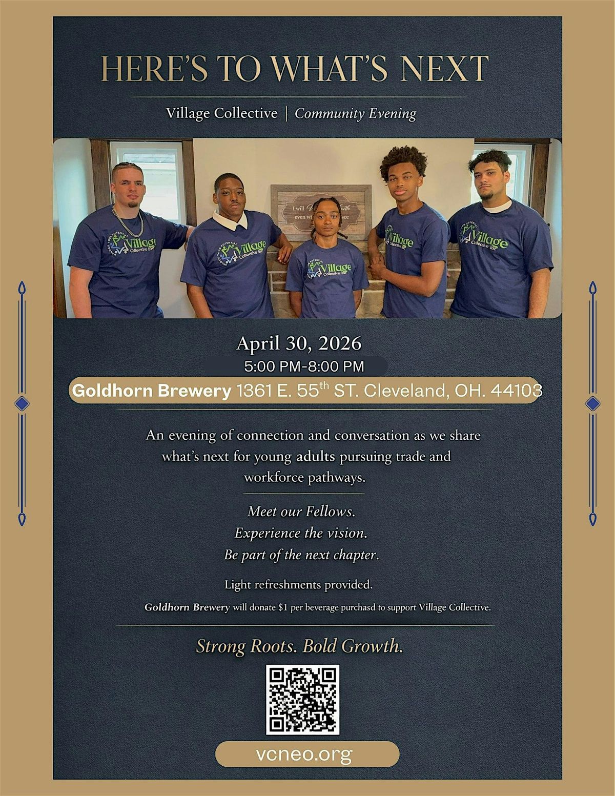 Join Village Collective for “Here’s to What’s Next,” an evening of connection, conversation, and community as we highlight the next chapter for young adults building pathways through trades, certifications, and workforce opportunities.