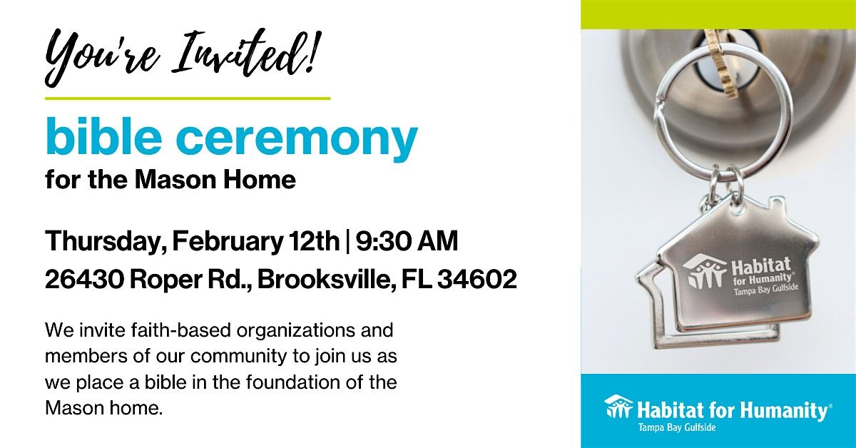 We invite faith-based organizations and members of our community to join as we place a bible in the foundation of the Mason home.