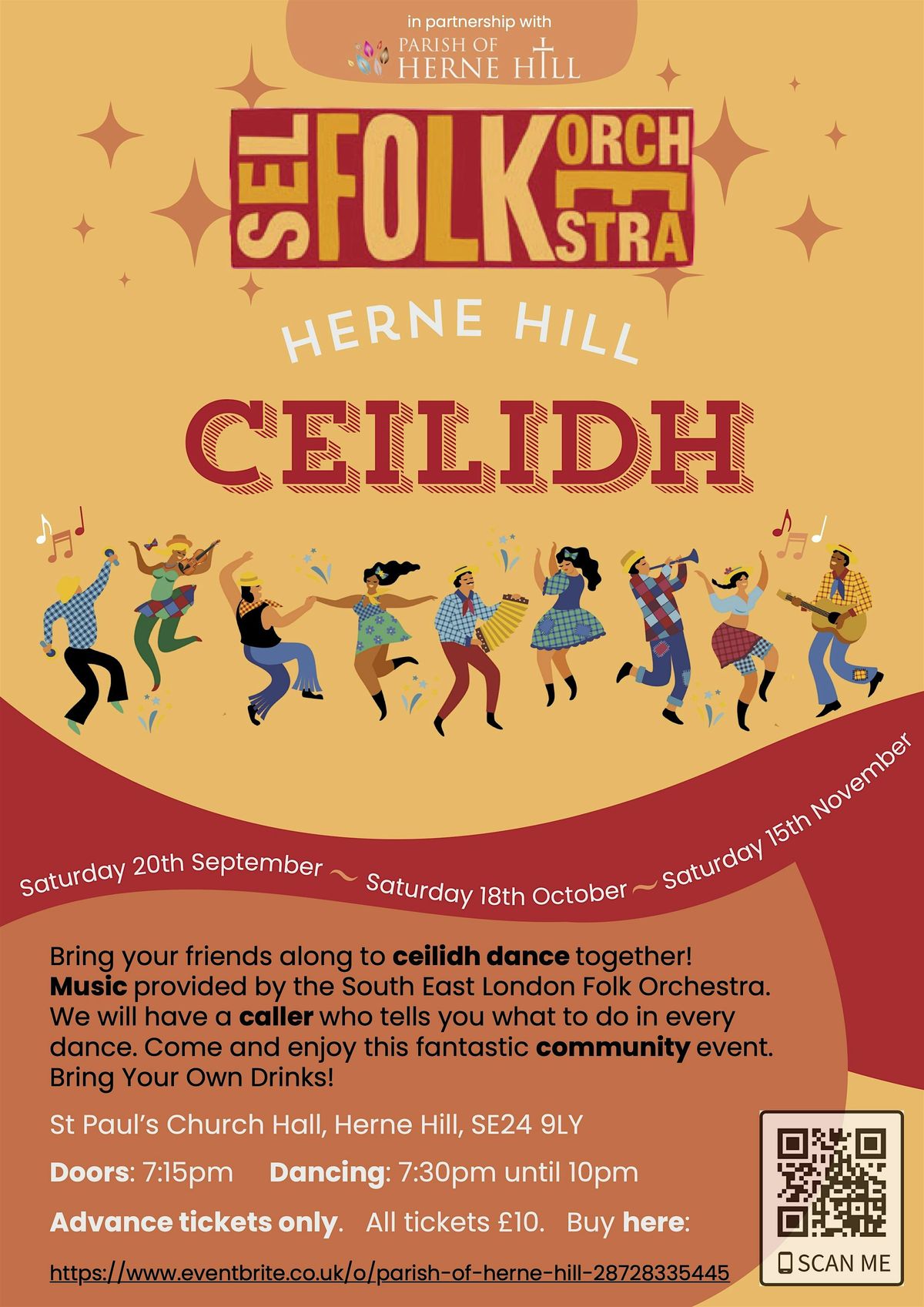 Bring your friends along to ceilidh dance together! Music provided by the South East London Folk Orchestra. We will have a caller who tells you what to do in every dance. Come and enjoy this fantastic community event. Bring Your Own Drinks!
