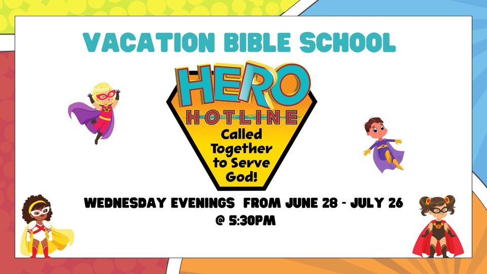 Vacation Bible School begins on Wednesday, June 28 at 5:30 p.m. and registration is now open! VBS will meet on Wednesday evenings, June 28 through July 26. All children who are 3-years-old (and using the potty) through 5th Grade (during the 2022-23 school year) are invited to attend. It's a fun away to learn how to use their faith in everyday life. Each night of VBS will focus on a Bible story that shows how we are called together to serve God. Each night will begin with dinner for the whole family. Then we move to our Bible Story Time, followed by rotating through Science, Mission, and Crafts. We encourage our young heroes to dress in super hero costumes or other attire fun attire during each session. Things are bound to get a little messy, so wear clothes that can be easily washed.