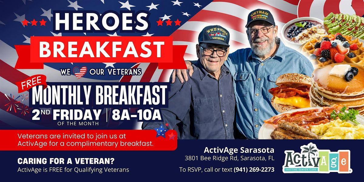 🇺🇸 Calling All Veterans! 🇺🇸 You're invited to our FREE monthly Heroes Breakfast at ActivAge Sarasota! 🥞🍳