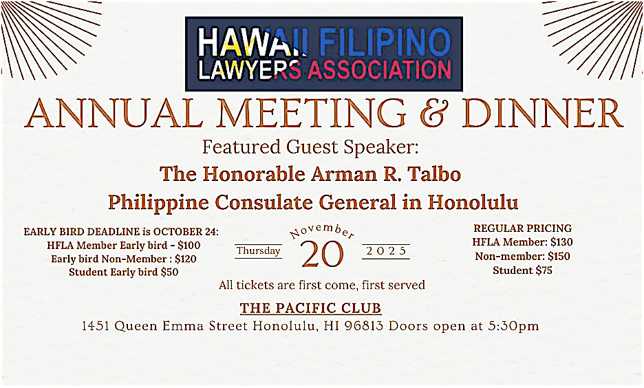Welcome to the HFLA Annual Meeting & Dinner! Join us for an evening of celebration and community at The Pacific Club. This in-person event is the perfect opportunity to connect with fellow members, hear exciting updates about our organization, and enjoy a delicious meal together. Don't miss out on this special occasion to come together and support our mission. We look forward to seeing you there!