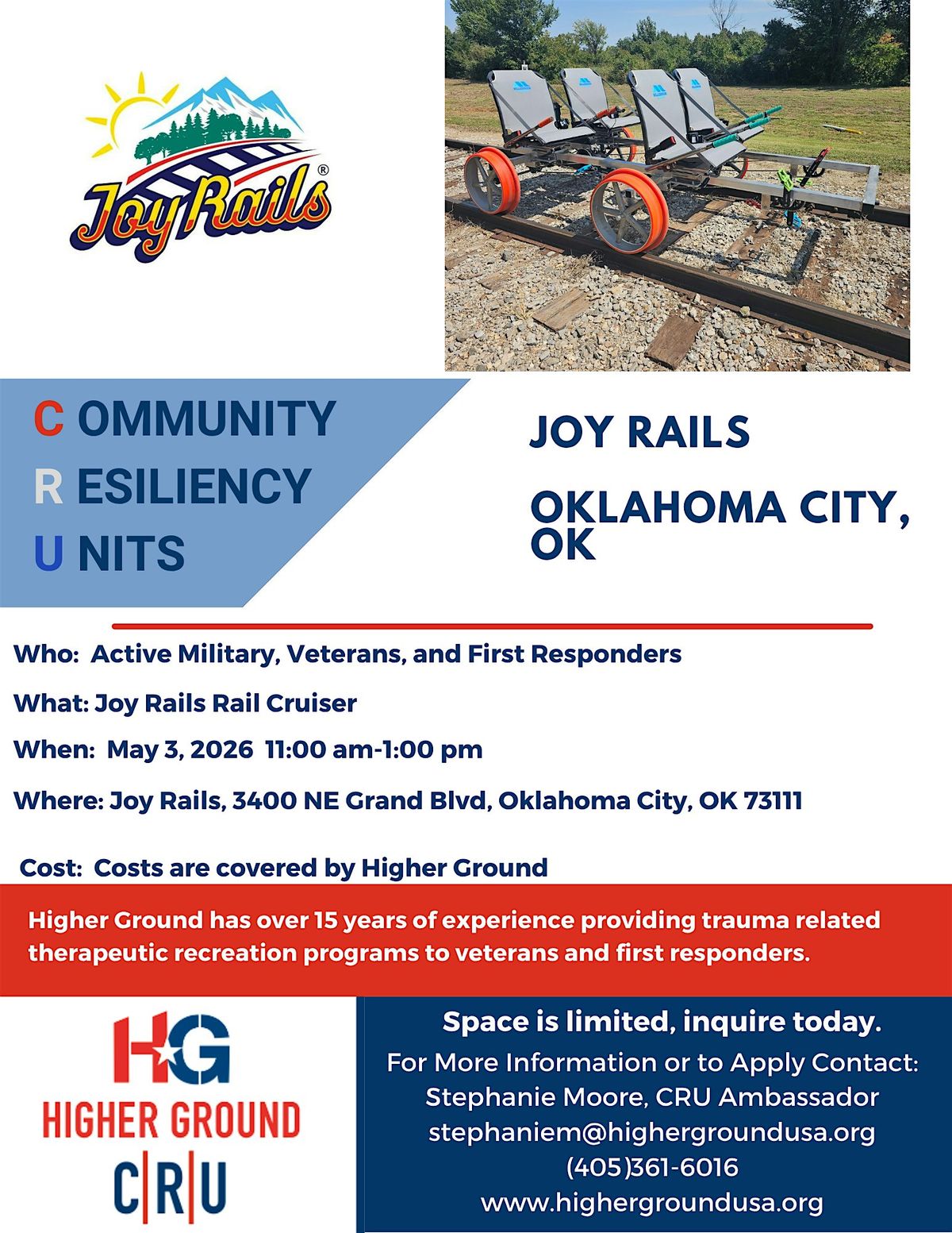 Come out for a good day of fun with HG CRU! Take in the sights from the rail cruiser as you pedal. Active duty, veterans, and first responders come out and see what Higher Ground is all about.