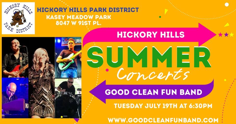 Join us at Kasey Meadow Park in Hickory Hills for a free concert with Good Clean Fun!Good Clean Fun delivers an exciting, engaging show, and features a playlist of party hits that span every decade! You can expect to hear all the best dance hits from every style of music! Motown, Disco, Golden Oldies, 80s New Wave, Pop, 90s, Swing, Jazz, a sprinkle of country, and of course today's top hits!