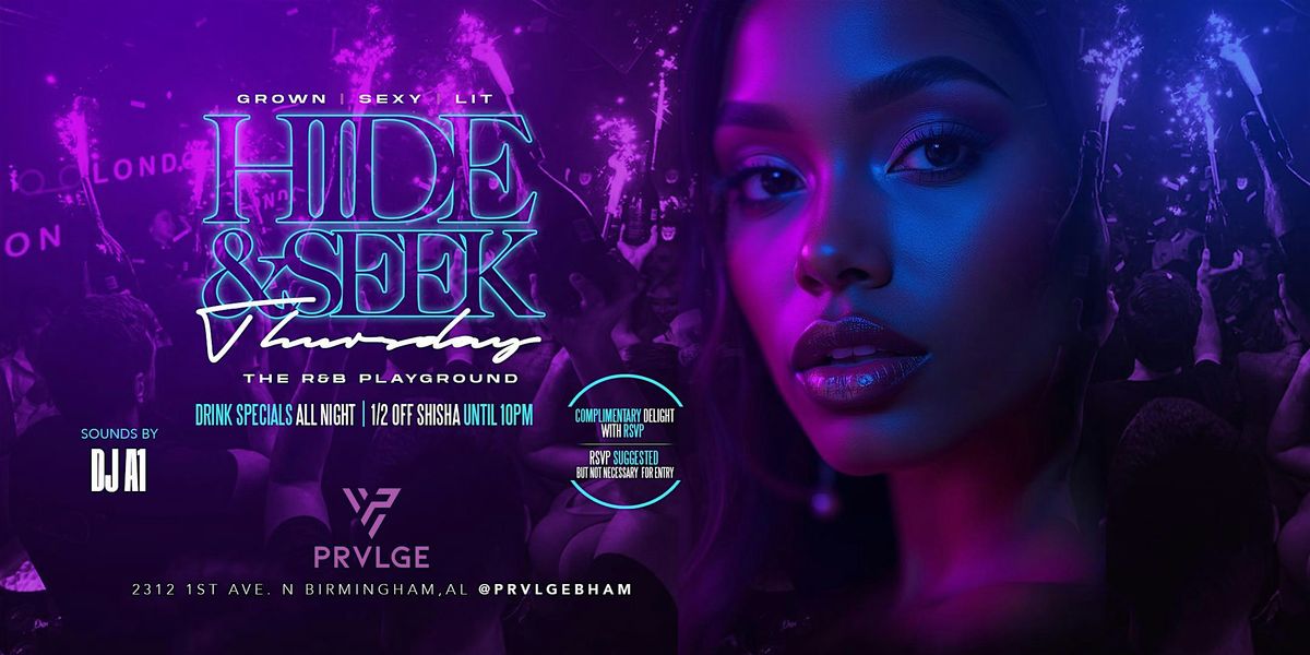 Step into the ultimate grown and sexy vibe every Thursday at PRVLGE with Hide & Seek β an R&B-driven experience where the energy is flirty, fun, and unapologetically lit. This isn't your average night out β it's a playground for R&B lovers, trendsetters, and those who know how to turn a weekday into a vibe.