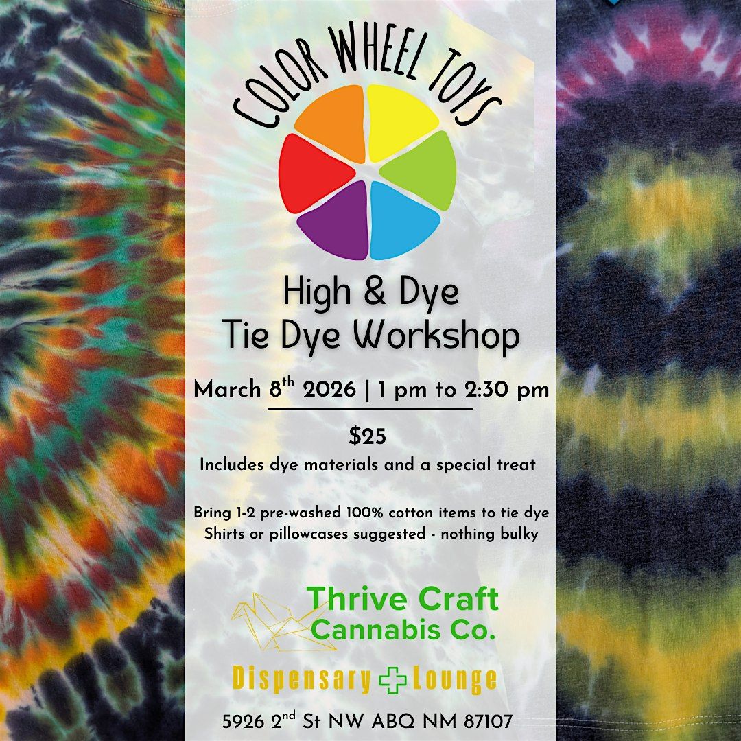 Get ready to unleash your creativity at our High & Dye Tie Dye Workshop! Join us in person for a fun and colorful experience where you'll learn intermediate tie-dye techniques to personalize your garments. Bring 1-2 prewashed 100% cotton garments to dye; nothing bulky. Ticket price includes all dyeing materials, instruction and a house beverage or a 'treat'. Ages 21+