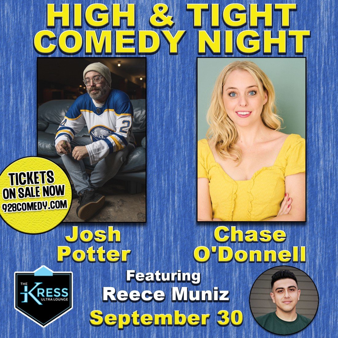 High & Tight Comedy Night is the best way to describe the headliners. Josh Potter is known for touring and opening for Tom Segura. Chase O'Donnell is the feature act touring with Christina Pazsitzky. Get excited for a hilarious show because these two comedians absolutely have their Mom Jeans on High & Tight!