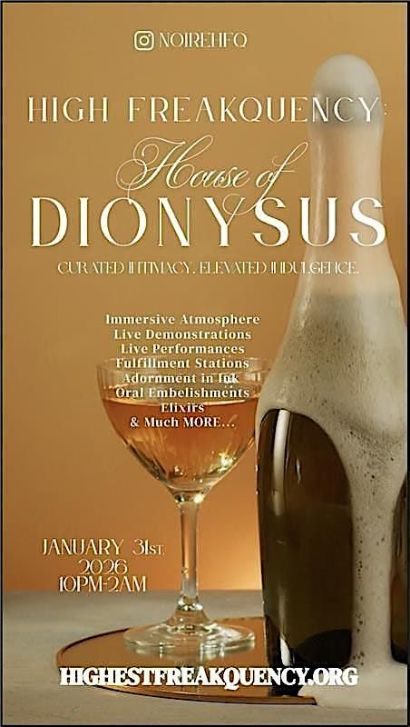 High FreakQuency presents House of Dionysus, a curated experience where education, art, sensuality, and intention converge. Rooted in the belief that learning lives in the body as much as the mind, this gathering invites guests to explore pleasure, curiosity, and self-awareness through intentional, consent-forward experiences.