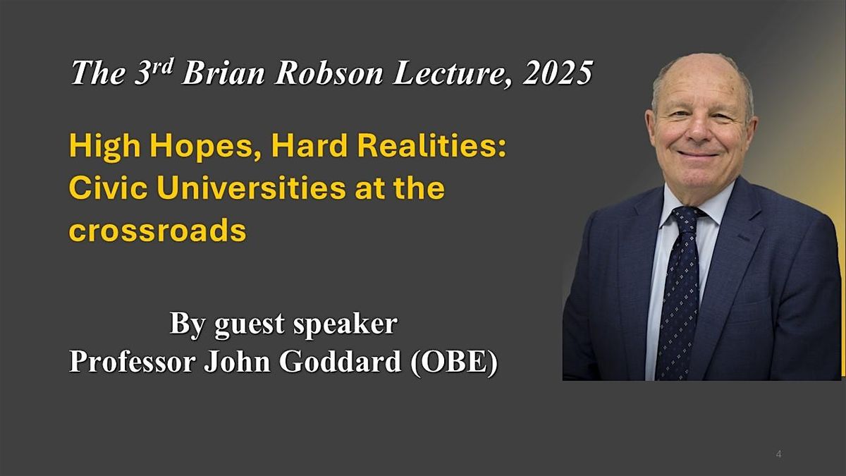 The Brian Robson Lecture is a biennial event named in honour of Brian Robson OBE, Emeritus Professor of Geography and Founder of Centre for Urban Policy Studies (now the Spatial Policy and Analysis Lab) at The University of Manchester, who died in June 2020.