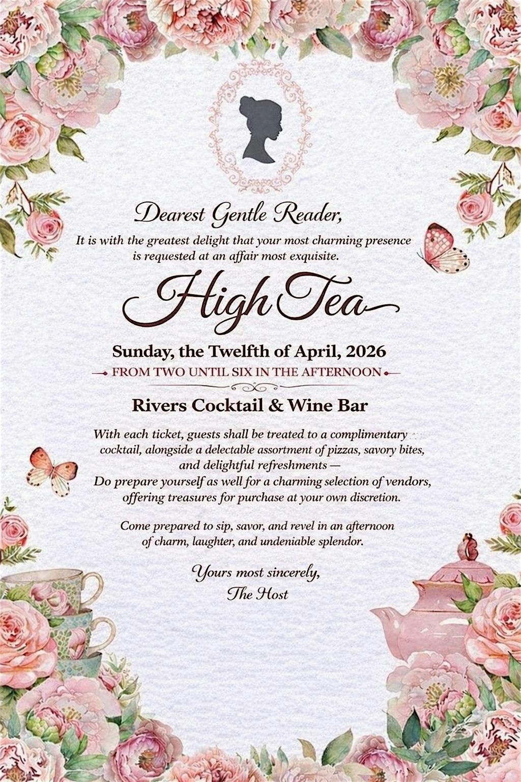 Step into an elegant afternoon of charm at High Tea, hosted at Rivers Cocktail & Wine Bar on Sunday, April 12 from 2–6 PM. Guests will enjoy a complimentary cocktail alongside a delightful assortment of pizzas, savory bites, and refreshing treats in a beautifully curated, Bridgerton-inspired setting.