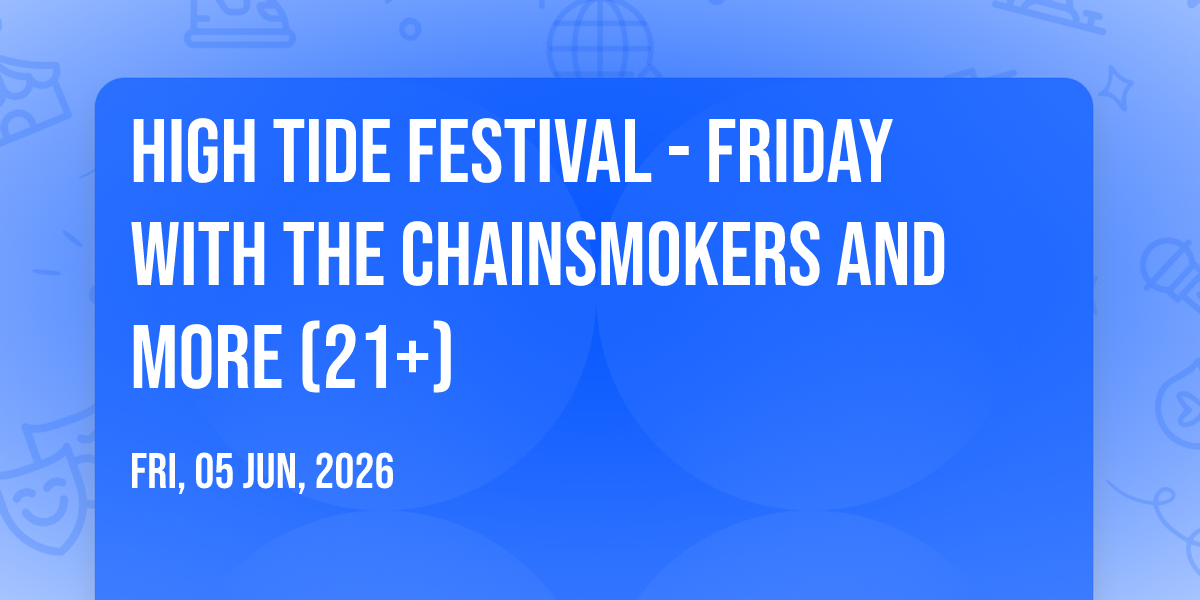 π Location: 32.8676, -79.9667π Welcome to High Tide Festival - Friday with The Chainsmokers and more (21+), where dreams come alive and possibilities are endless! ποΈ Join us at Riverfront Park - SC in the heart of North Charleston, SC for an event that defies expectations. π On June 5th, 2026 at 04:00 PM, be part of something truly extraordinary as we bring together innovation, entertainment, and pure magic. β¨ Every aspect has been carefully designed to ensure an unforgettable experience for all our guests. Whether you're seeking adventure, inspiration, or simply a break from the ordinary, this event promises to deliver beyond your wildest dreams. π Prepare for a journey into the extraordinary!
