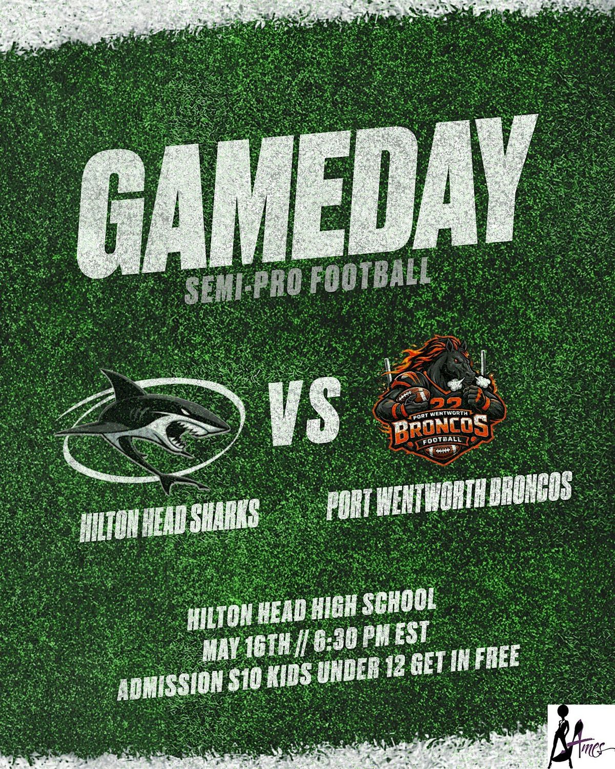 The Hilton Head Sharks(SC) will host the Port Wentworth Broncos(GA) for an adult tackle football game. The game will be held at Hilton Head Island High School. This event is open to the public and fans of all ages are welcome to attend. Children 12 and under are free. Discounted early bird tickets will be available until April 7th. Gates will open at 5:30pm. Game will kickoff at 6:30pm. Food truck will be onsite. For more information please visit hhsharks.com. For questions contact Andrea with AMES 1-888-981-SHOW(7469)