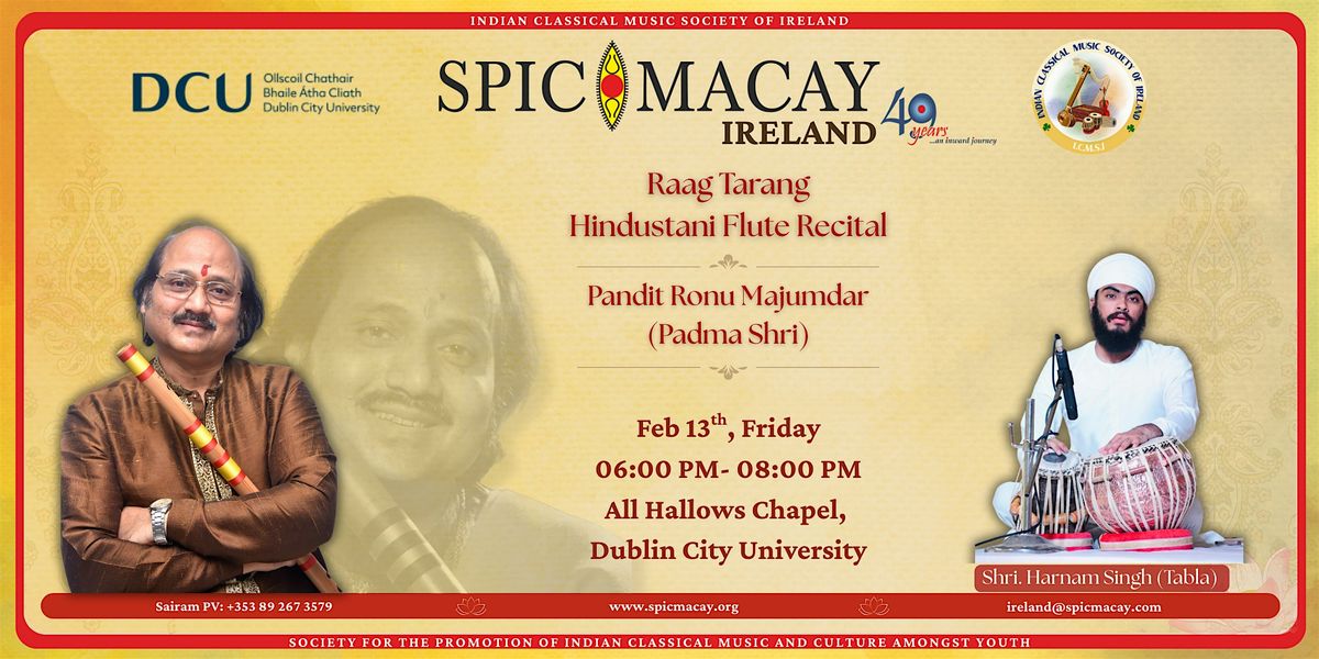 SPIC MACAY Ireland in collaboration with ICMSI, DCU's School of Music and Ireland India Institute present Raag Tarang, an echanting evening of Hindustani Flute Recital by Pandit Ronu Majumdar (Padma Shri) at All Hallows Chape, DCU.