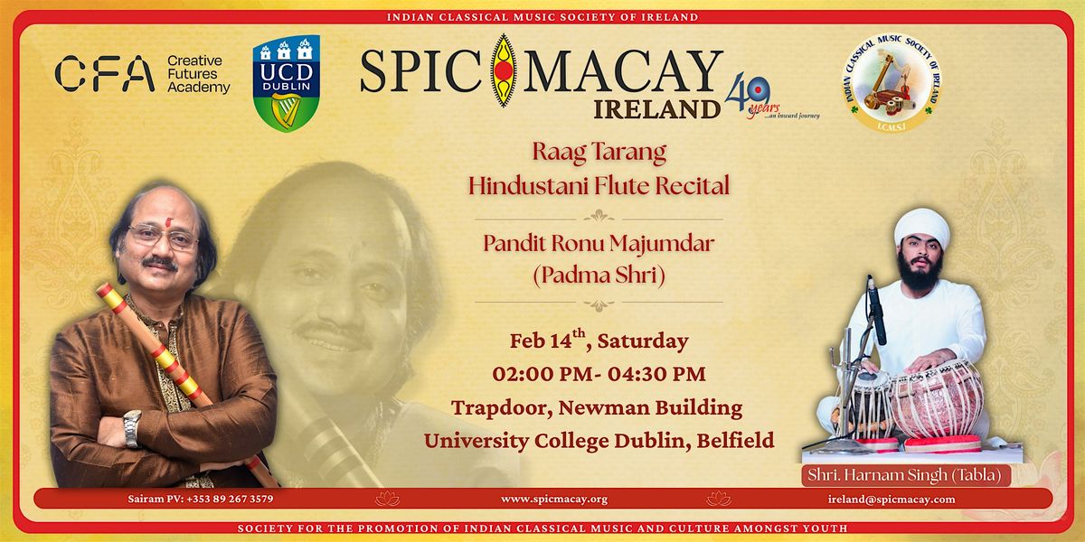 SPIC MACAY Ireland in collaboration with ICMSI, UCD's Creative Futures Academy present Raag Tarang, an echanting afternoon of Hindustani Flute Recital by Pandit Ronu Majumdar (Padma Shri) at Trapdoor, UCD.