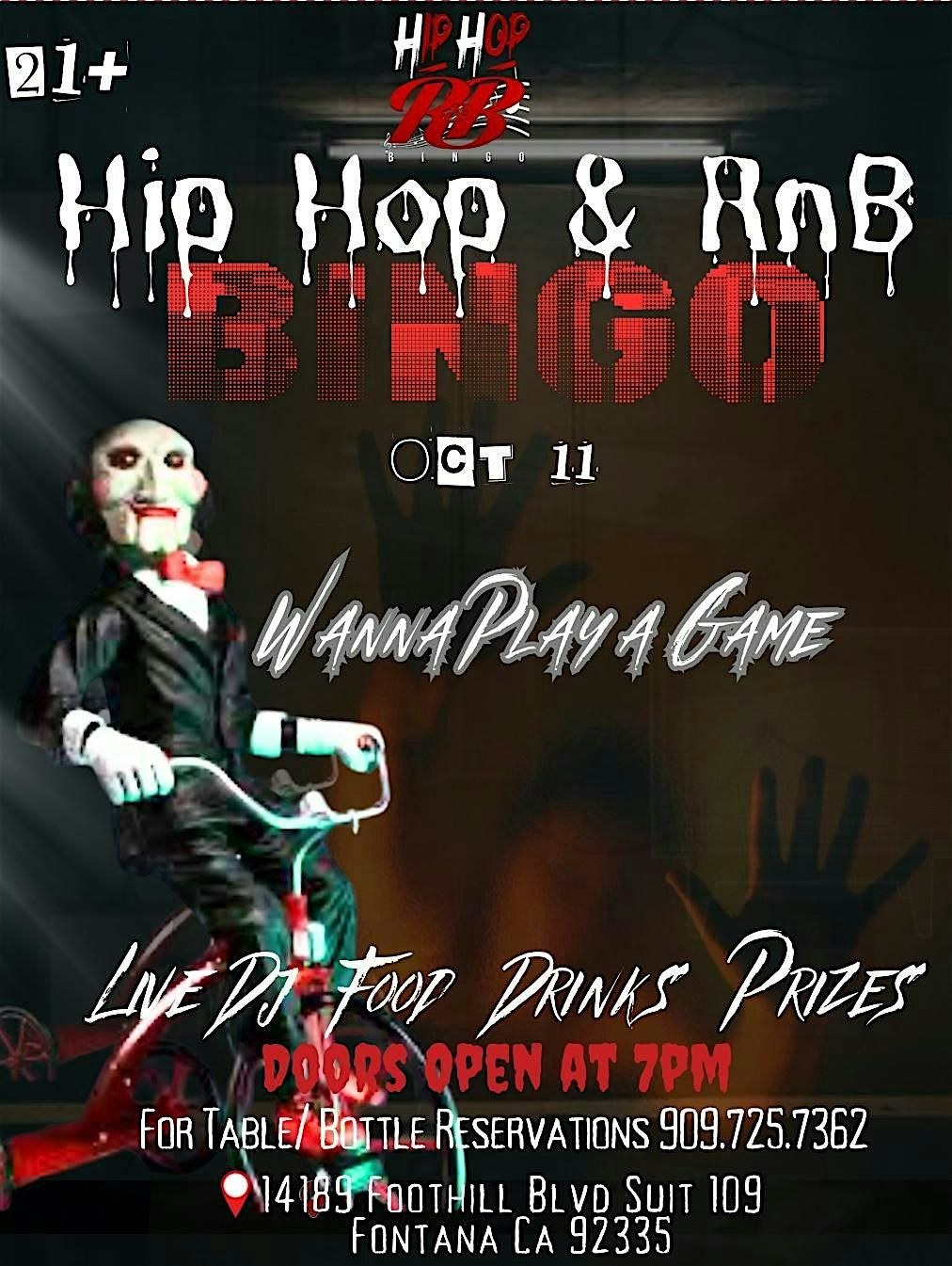 Come join us at 14189 Foothill Blvd, suit 109 Fontana, CA, on October 11, 2025 at 7:00 pm for a turnt up game of Hip Hop and RnB Bingo. Bring your friends and enjoy a unique twist on a classic game with your favorite tunes!
