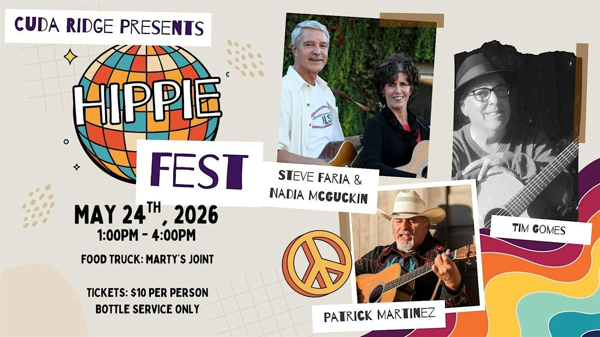 Get ready to groove to tunes of the 60’s and 70′ performed by Tim Gomes, Pat Martinez, Steve Faria, and Nadia McGuckin at our annual Hippie Fest on May 24th! Each of the musicians will perform solo, acoustic sets (with perhaps so Duo’s mixed in), followed by a Jam Session at the end of the day.